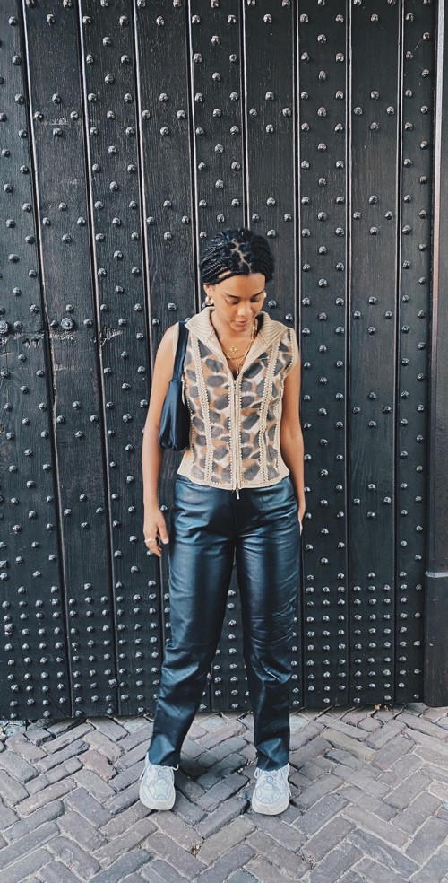 Hier heb ik de spencer gecombineerd met een zwarte leren broek. Deze broek komt van de kilosale in Tilburg, later meer hierover.